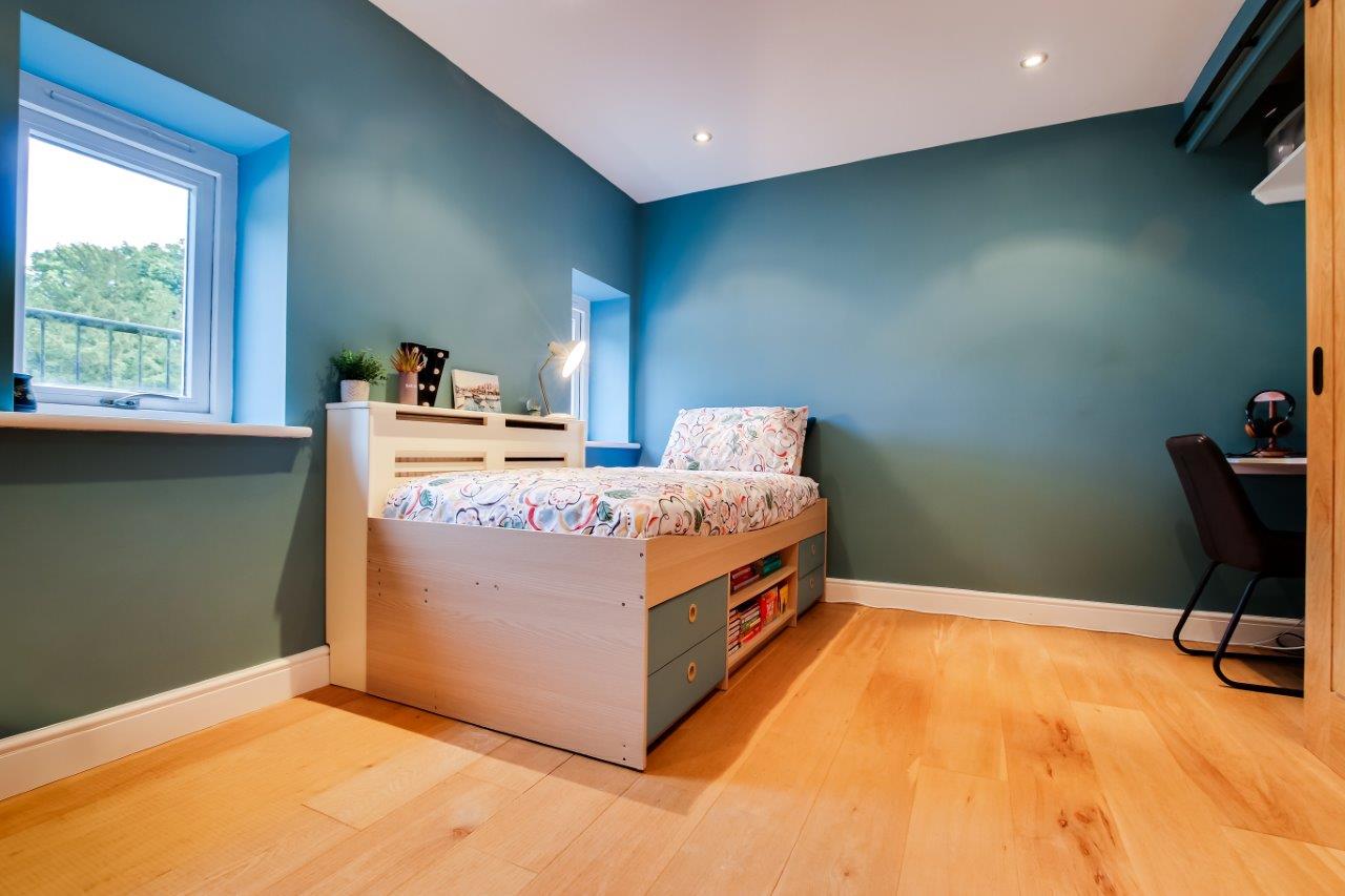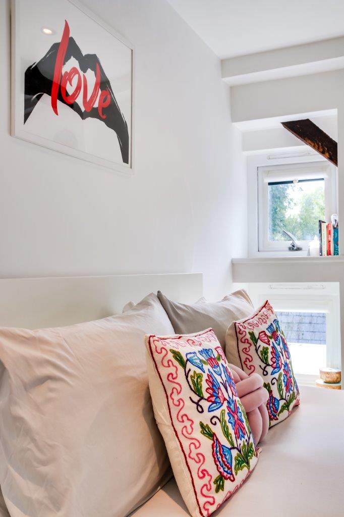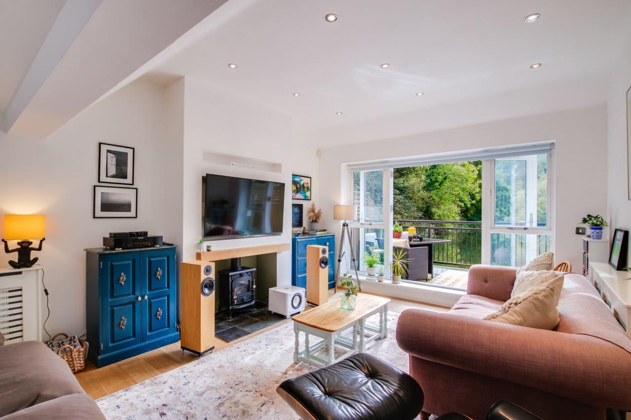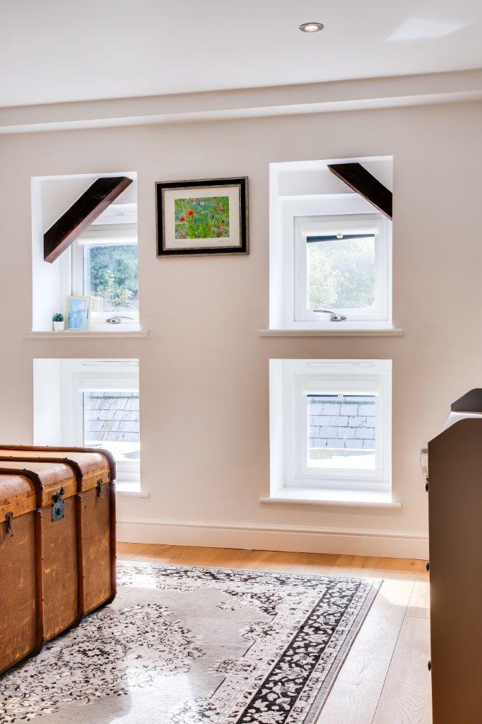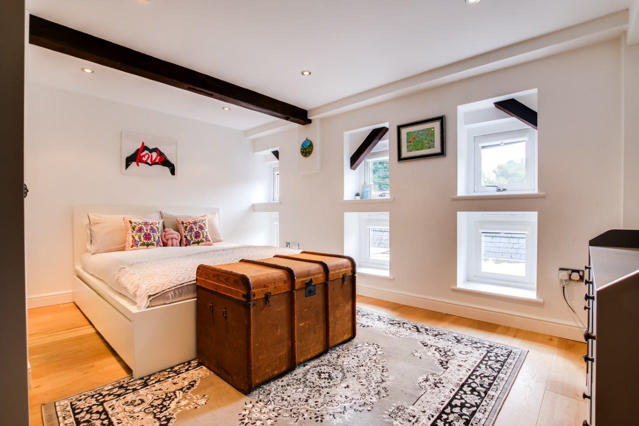This modern conversion manages to keep reminding that it is a conversion, it has character; a Grade II listed building, timbers, windows, the tiered layout all add to the charm of life here, a little corner for a desk to work at and that deck that puts you at the water’s edge, the rush of water beside you escaping the pond and heading off down the valley, a reminder that all is not completely still, there's excitement too.