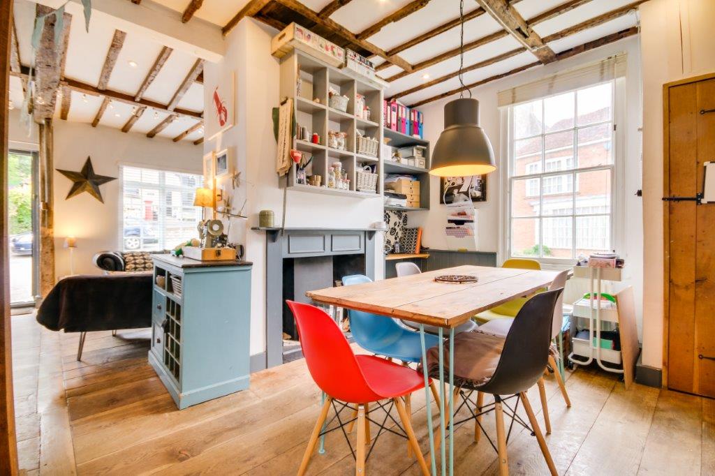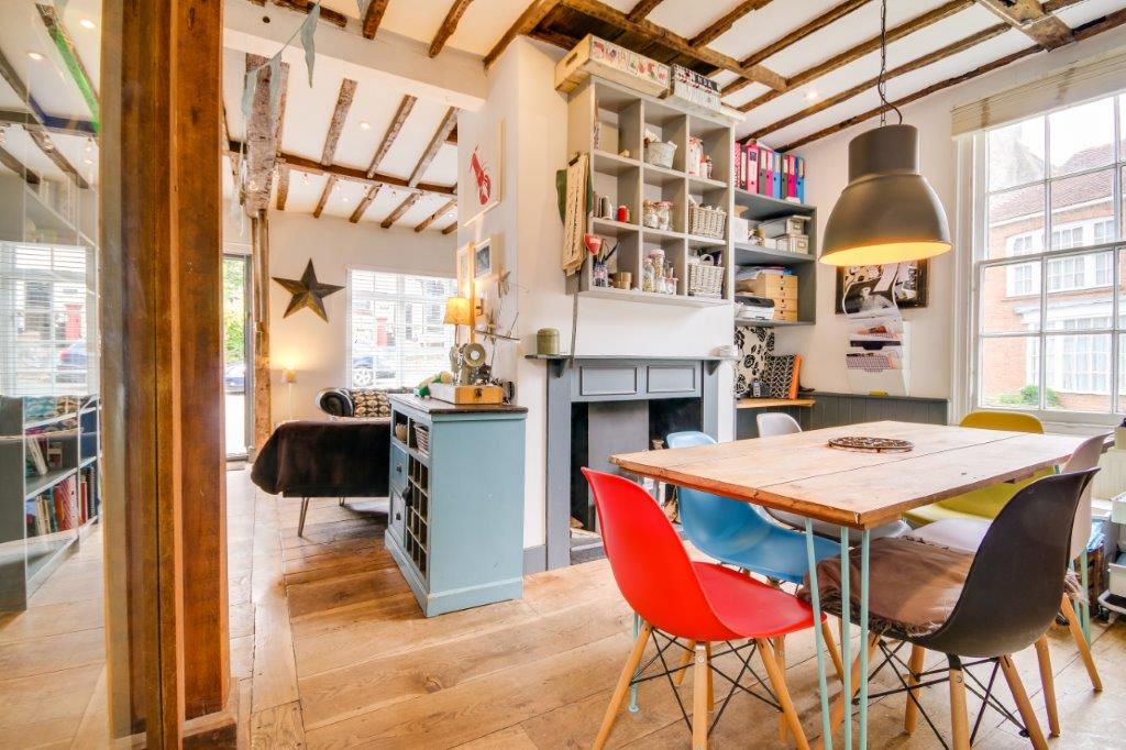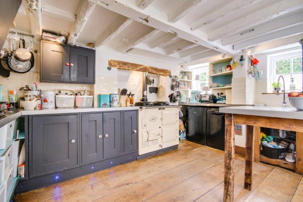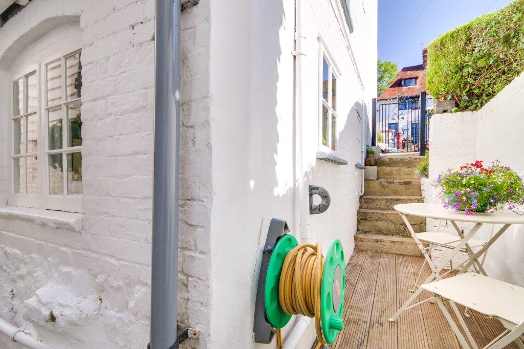 Explore downstairs and the beamed kitchen, home to that Aga, awaits. Windows seem to keep appearing as you explore the nooks and crannies of this space, there is a charm here and a quirkiness that is in keeping with all four floors of this home. Step out of the door and a passageway weaves around the house. Bistro tables are the order of the day, perfect sentinels by which to perch with a good friend be they of two legged or many paged variety.